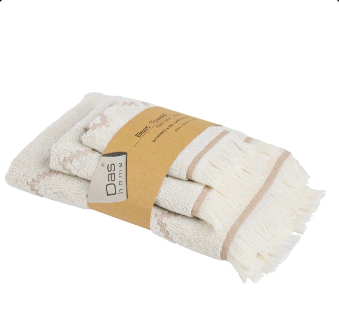 Σετ πετσέτες 3 τεμαχίων της σειράς Best, με κρόσια. Είναι από 100% βαμβάκι υψηλής ποιότητας, ιδιαίτερα απαλές, απορροφητικές και ανθεκτικές στην χρήση με βάρος 450gr/m2. Τα χρώματα που χρησιμοποιούνται είναι ανεξίτηλα και υποαλλεργικά. Το σετ αποτελείται από μία πετσέτα μπάνιου 70Χ140εκ., μία πετσέτα προσώπου 50Χ90εκ. και μία πετσέτα χεριών 30Χ50εκ. Das home…makes your house a home!