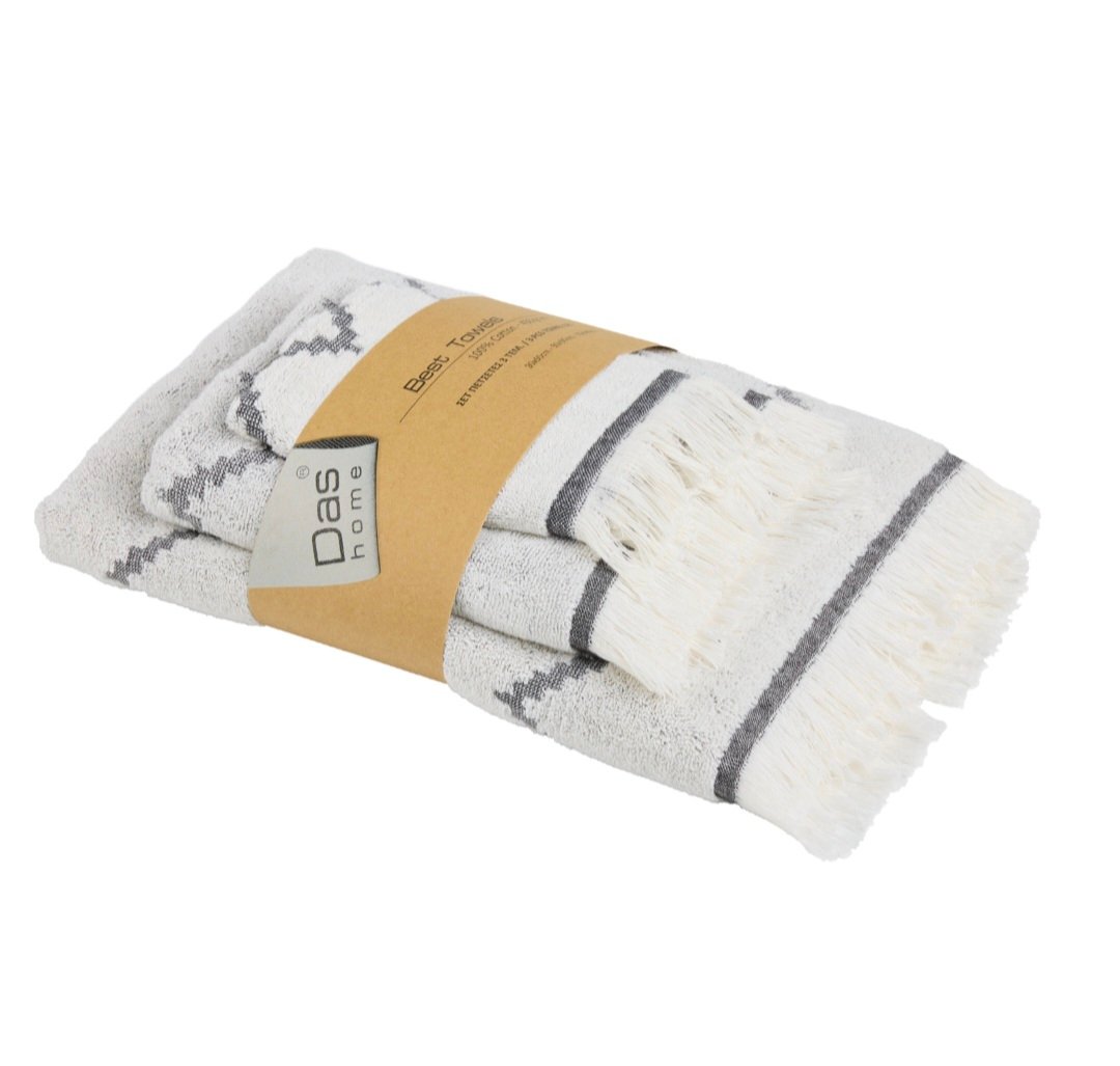 Σετ πετσέτες 3 τεμαχίων της σειράς Best, με κρόσια. Είναι από 100% βαμβάκι υψηλής ποιότητας, ιδιαίτερα απαλές, απορροφητικές και ανθεκτικές στην χρήση με βάρος 450gr/m2. Τα χρώματα που χρησιμοποιούνται είναι ανεξίτηλα και υποαλλεργικά. Το σετ αποτελείται από μία πετσέτα μπάνιου 70Χ140εκ., μία πετσέτα προσώπου 50Χ90εκ. και μία πετσέτα χεριών 30Χ50εκ. Das home…makes your house a home!