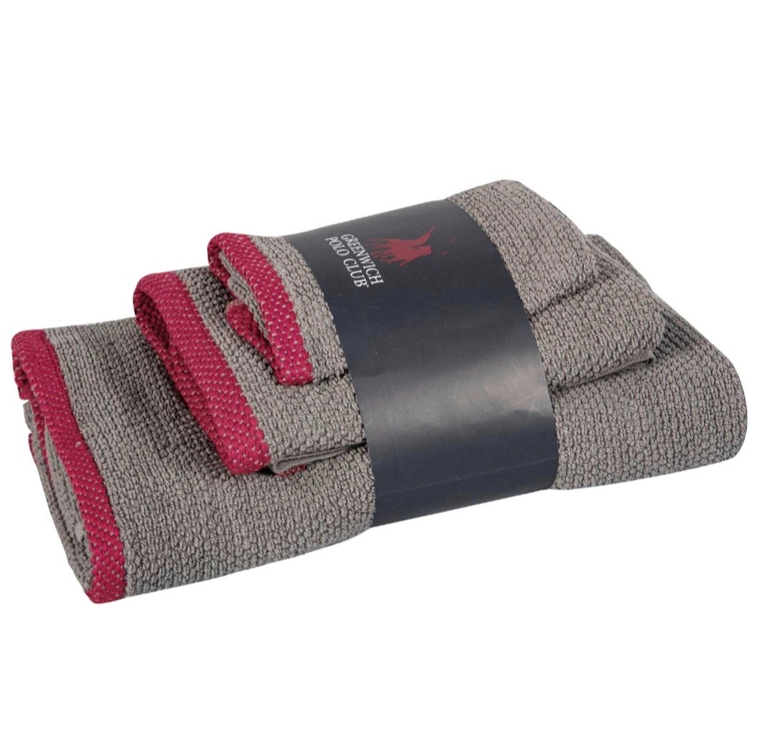 - Σετ πετσέτες Greenwich Polo Club με διακοσμητική μπορντούρα. Έχει βάρος 480gr/m2 και η σύνθεση είναι 100% βαμβάκι. Είναι ιδιαίτερα απαλές, απορροφητικές και ανθεκτικές, ενώ τα χρώματα που χρησιμοποιούνται είναι ανεξίτηλα και υποαλλεργικά. Το σετ αποτελείται από 3 πετσέτες σε διαστάσεις 30Χ50εκ, 50Χ90εκ, 70Χ140εκ. Επιλέξτε Greenwich Polo Club για να απολαύσετε ποιότητα, στυλ και πολυτέλεια